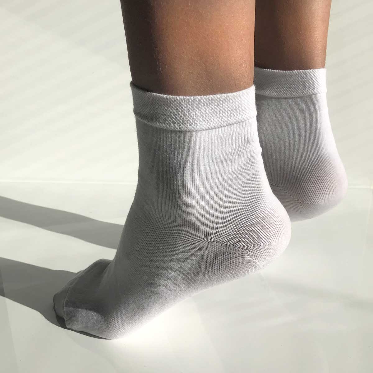 Myke kvartsokker/ høye ankelsokker i høy kvalitet bambusviskose strikket med 200 små nåler, med behagelig strikk øverst. Skånsom mot huden, puster og lar fuktighet slippe ut, i tillegg til silver ioner for anti-lukt egenskaper. Ingen sjenerende søm foran på tå – du unngår bulk og irritasjoner som kan forårsakes av tradisjonelle sømmer.